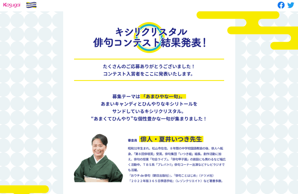 あまいキャンディと、ひんやりなキシリトールをサンドしているキシリクリスタル。募集テーマは「あまひやな一句」です。個性豊かな句が集まり、特選・優秀句・佳作は、キシリクリスタルの個包装に掲載されました。