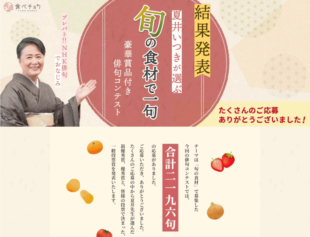 日本最大のオンライン直売所〈食べチョク〉主催の俳句コンテストです。投句テーマは1月から3月の「旬の食材」。食材をリアルに再現して香りまで漂ってくるような、五感を刺激される俳句がたくさん集まりました。