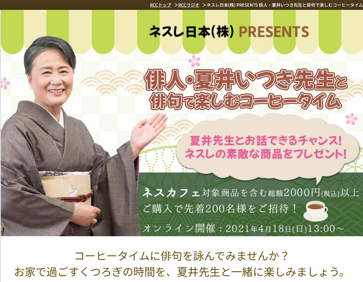 ネスレの商品を購入して句会ライブに参加しよう!ネスレ日本(株)の商品購入者を対象に、限定200名参加の句会ライブを行いました。当日はコーヒーにちなんだテーマで創作。当日グランプリには素敵な商品が贈られました。https://radio.rcc.jp/2021/nestle/